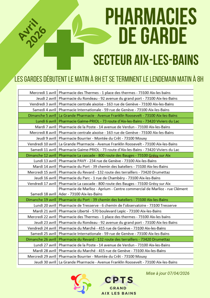 Retrouvez ici le planning des pharmacies de garde pour le mois de Juin 2025 sur le secteur d'Aix-les-Bains